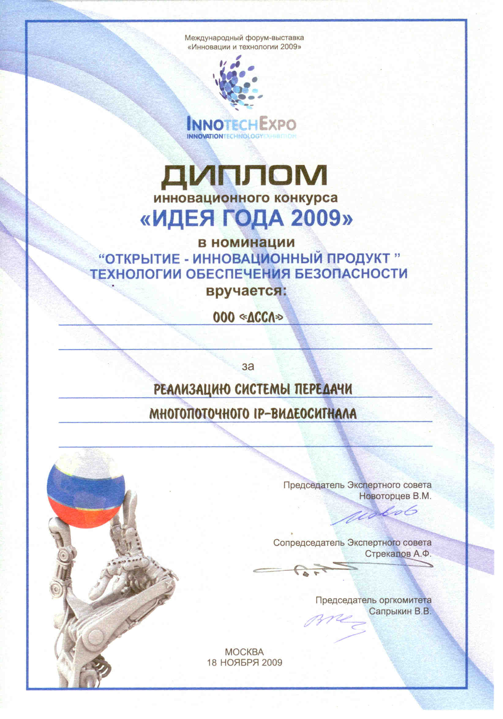 Диплом и медаль первой степени в номинации "Системы наблюдения и охранного телевидения" конкурсной программы "Лучшие инновационные решения в области безопасности 2008 года" -