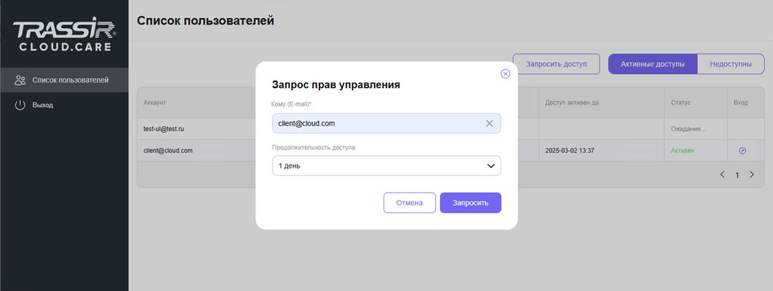 Получение доступа к клиентской учетной записи в TRASSIR Cloud состоит из двух этапов. На первом этапе происходит запрос доступа, а на втором клиент его подтверждает или отклоняет.