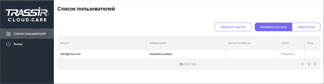 После нажатия кнопки Запросить запись появится в таблице пользователей со статусом Ожидание.... При необходимости можно добавить комментарий с описанием работ, запланированных в учетной записи клиента.