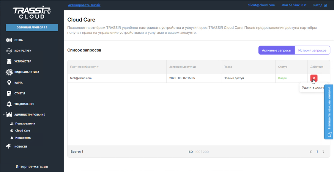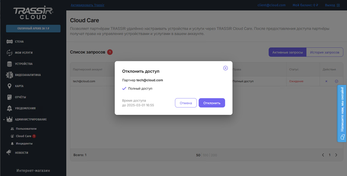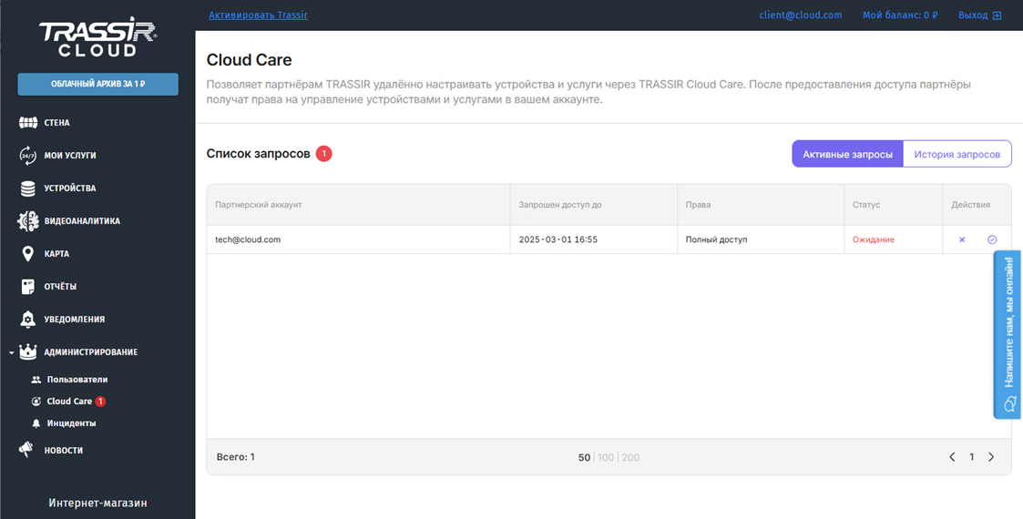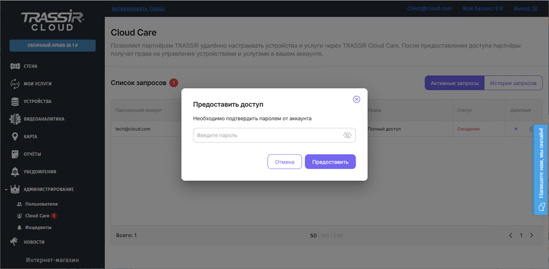 Для подтверждения доступа клиенту нужно войти в свою учетную запись в TRASSIR Cloud и перейти в раздел Администрирование → Cloud Care.