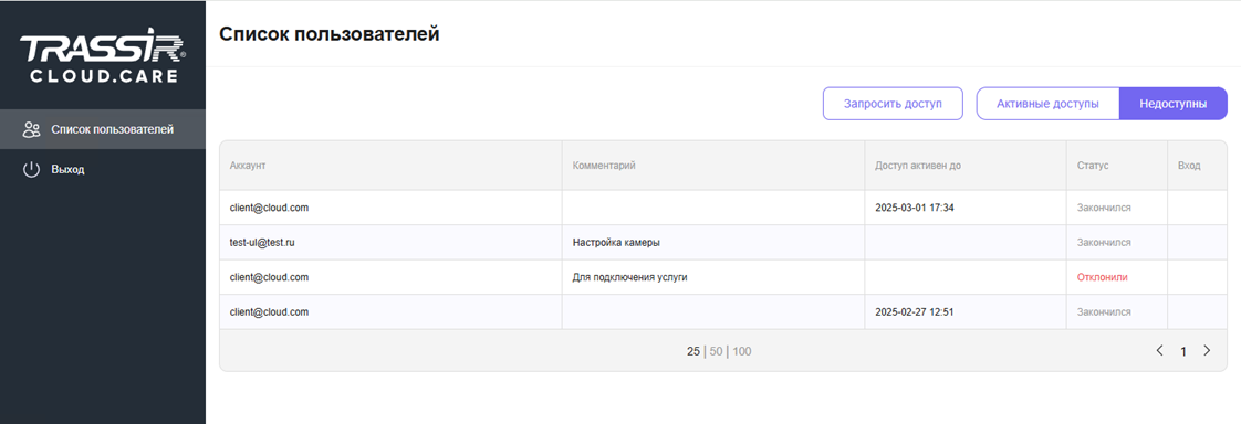 - Перейти на вкладку Недоступны, где показаны учетные записи с закончившимся или отклоненным доступом.