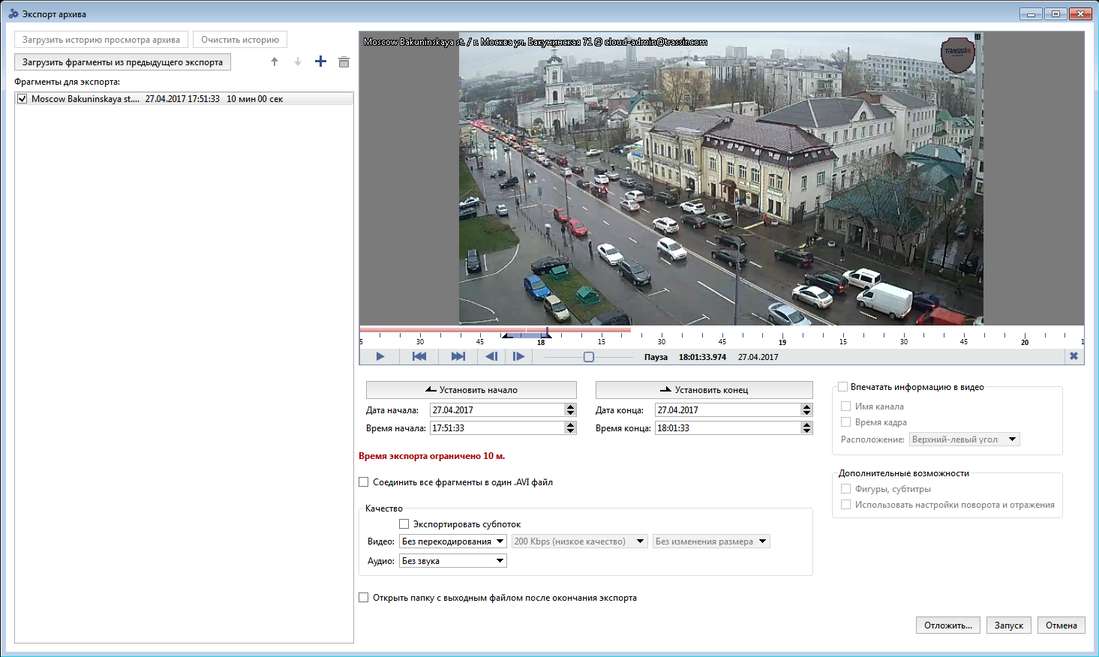 Подробнее об остальных настройках экспорта вы можете прочитать в Руководстве оператора в разделе Экспорт архива в видеофайл.