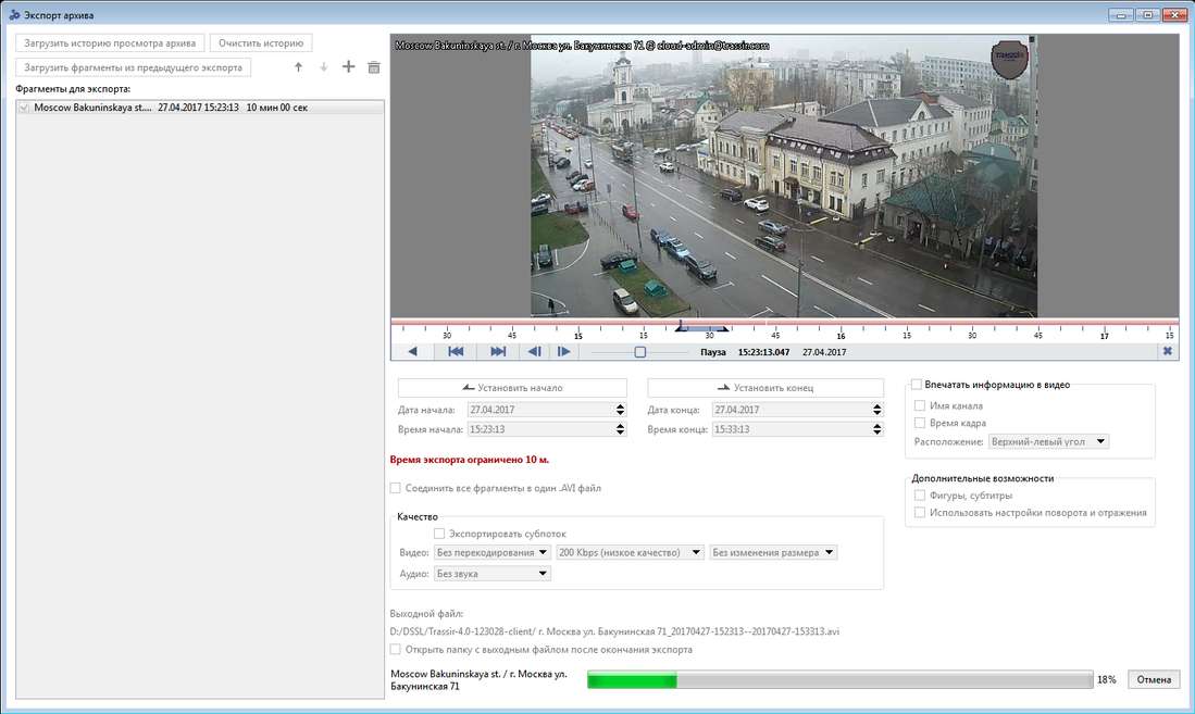 Максимальный интервал экспортируемого фрагмента зависит от тарифа подключения камеры к TRASSIR Cloud.