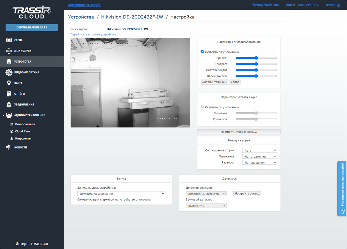 Детекторы - в данной области производится настройка детектора движения и звукового детектора, используемых для активации функций запись архива в TRASSIR Cloud и рассылка уведомлений о движении в кадре или звуке рядом с камерой.