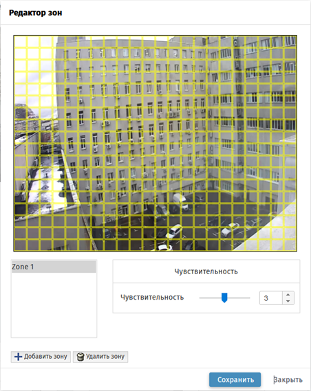 Кнопки Настроить зоны... и Настроить звук... открывают редакторы зон соответствующего детектора. Параметры Чувствительность и Порог определяют уровень чувствительности каждого детектора, при превышении значения которого будет срабатывать детектор.
