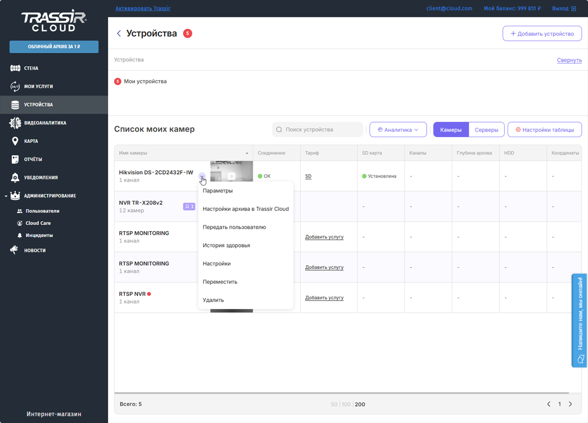 Чтобы перейти к настройкам параметров, нажмите на кнопку рядом с названием устройства в облаке и выберите пункт Параметры.