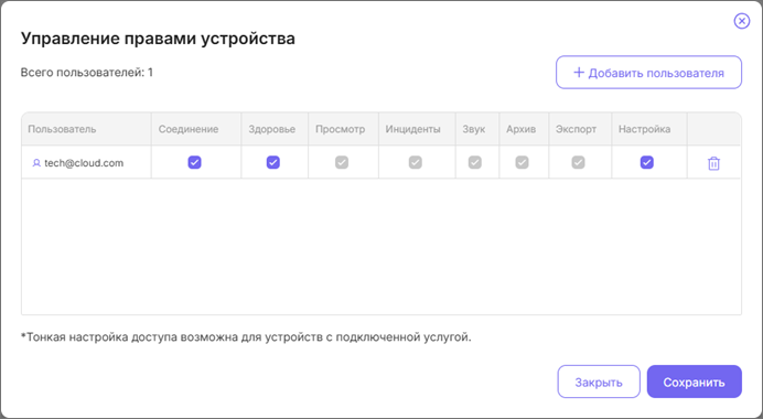 На устройствах, где не подключена ни одна услуга, нельзя детально настроить следующие права доступа: Просмотр, Инциденты, Звук, Архив, Экспорт и Настройка.