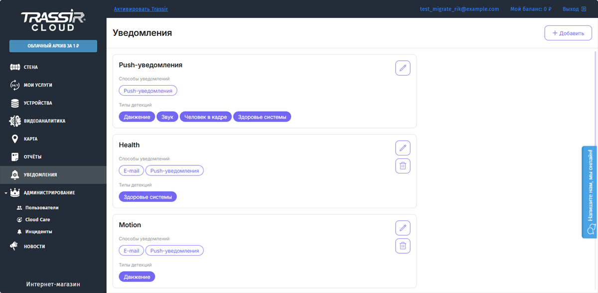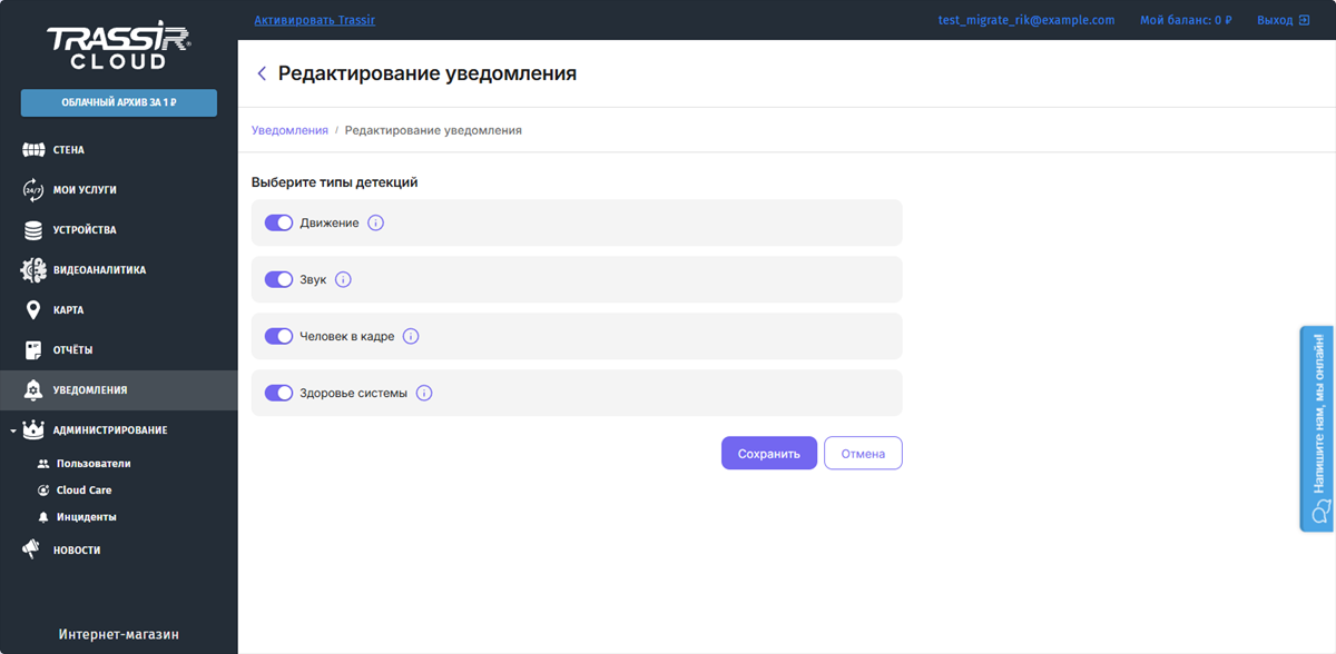 Уведомления о движении, звуке и наличию человека в кадре доступны только для каналов, на которых включена услуга запись архива в облако.