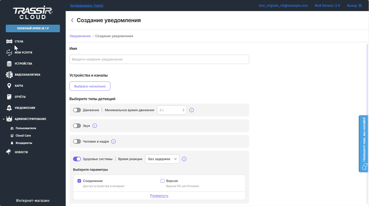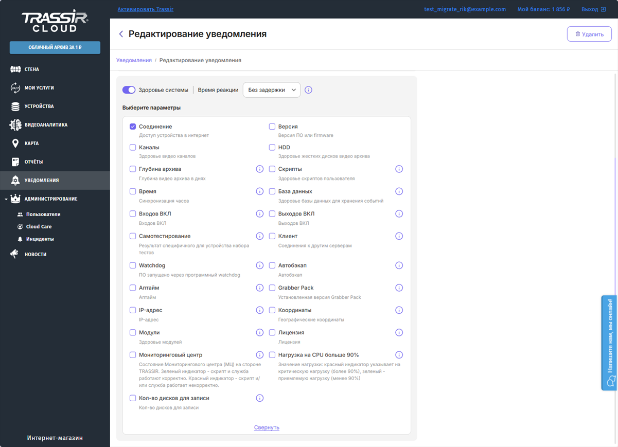 Уведомления о здоровье доступны для всех устройств, подключенных к облаку, и их каналов.