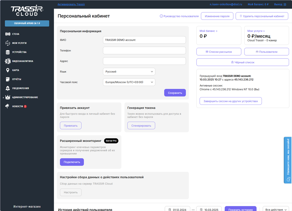- Управлять персональными данными: уточнить свои данные, сменить пароль, удалить персональный кабинет и привязать аккаунт TRASSIR Cloud к различным сервисам авторизации.