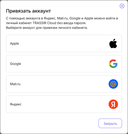 Нажмите кнопку Привязать, чтобы открыть окно привязки аккаунта TRASSIR Cloud к различным сервисам авторизации. После этого вы можете использовать их для авторизации в TRASSIR Cloud.