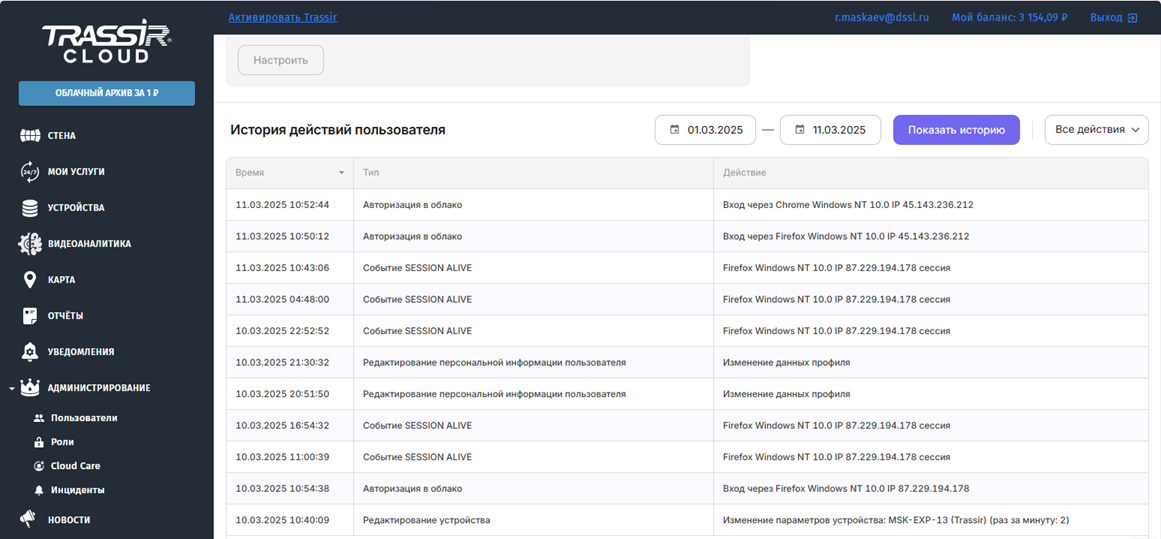 В блоке История действий пользователя показаны действия, производимые с вашим аккаунтом. Для отображения нужной информации измените настройки фильтра и нажмите кнопку Показать историю.