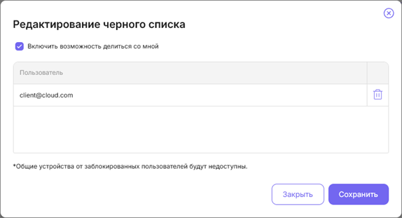 - Управлять пользователями: настроить права доступа и черный список пользователей.