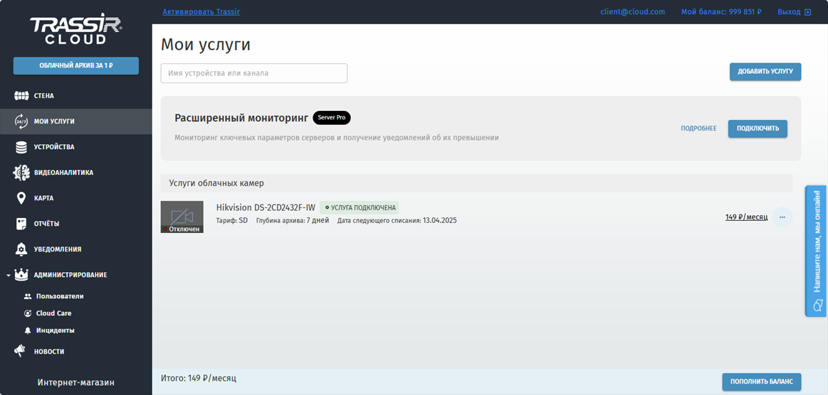 Услуги в TRASSIR Cloud позволяют включить запись архива в облаке. Добавлять новые услуги и управлять подключенными можно в