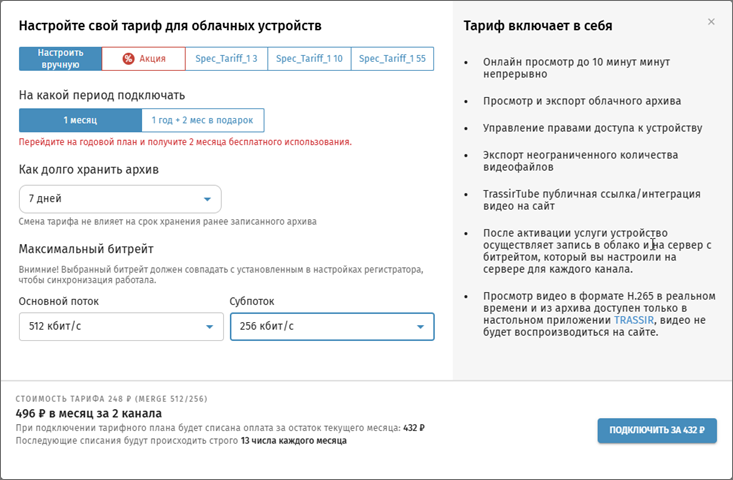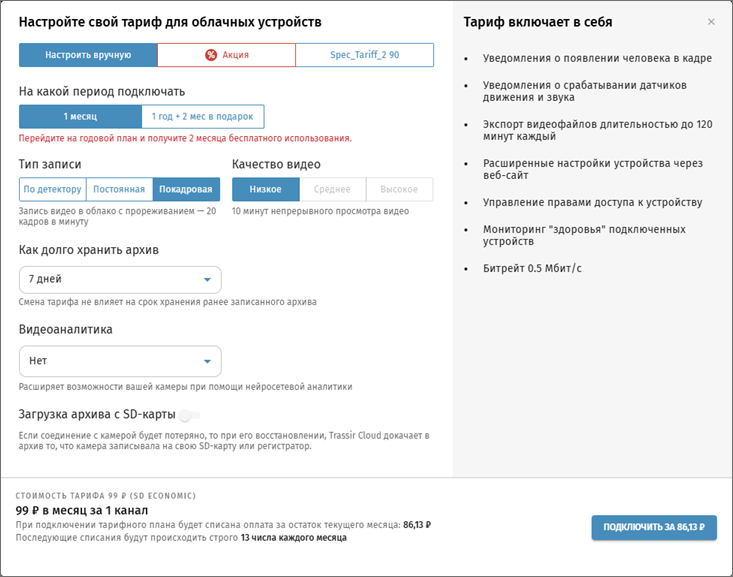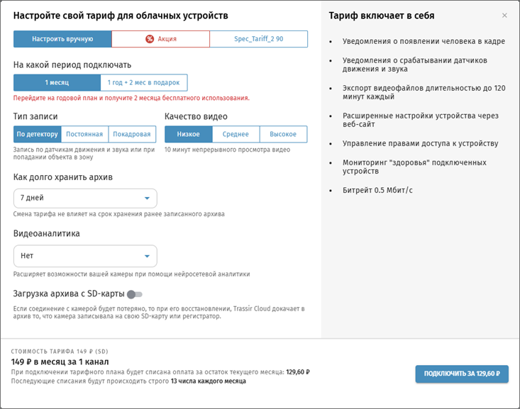 Выберите Тариф, как долго хранить архив и тип видеоаналитики, если она требуется. Нажмите Подключить.