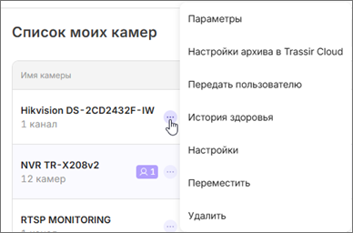 Услугу Запись архива в TRASSIR Cloud можно включить и настроить не только в меню Мои услуги, но и везде, где отображается видео с канала. Для этого откройте контекстное меню настроек канала и выберите пункт Подключить запись архива в облако или Настройки архива в TRASSIR Cloud.