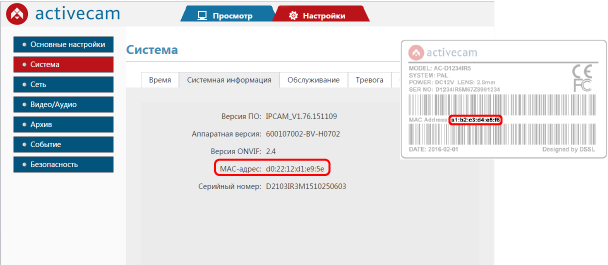 MAC-адрес камеры можно посмотреть на стикере или в WEB-интерфейсе.