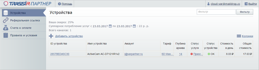 У клиента, которому вы предоставляете платный доступ к камере должен быть аккаунт в облачном сервисе TRASSIR Cloud. Если аккаунта нет, то вы можете создать его во время добавления устройства. Для самостоятельной регистрации отправьте клиенту партнерскую ссылку.