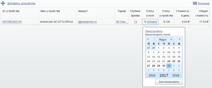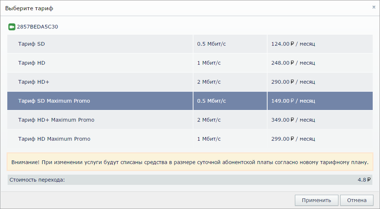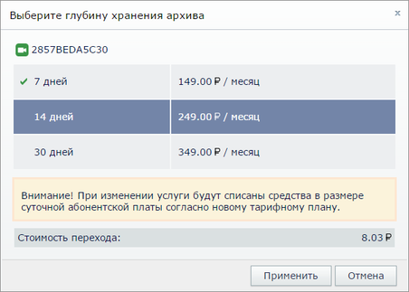Нажимая на значения в колонках Тариф и Глубина архива вы определяете тарифный план, по которому ваш клиент будет пользоваться камерой и размер архива, доступного ему.