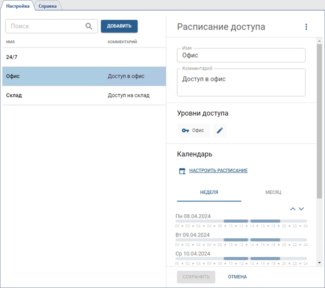 Данный раздел позволяет создавать и редактировать расписания, используемые для настройки уровней доступа.