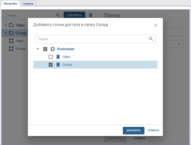 Чтобы в одну папку добавить сразу несколько точек доступа, выберите в дереве папку, нажмите на кнопку