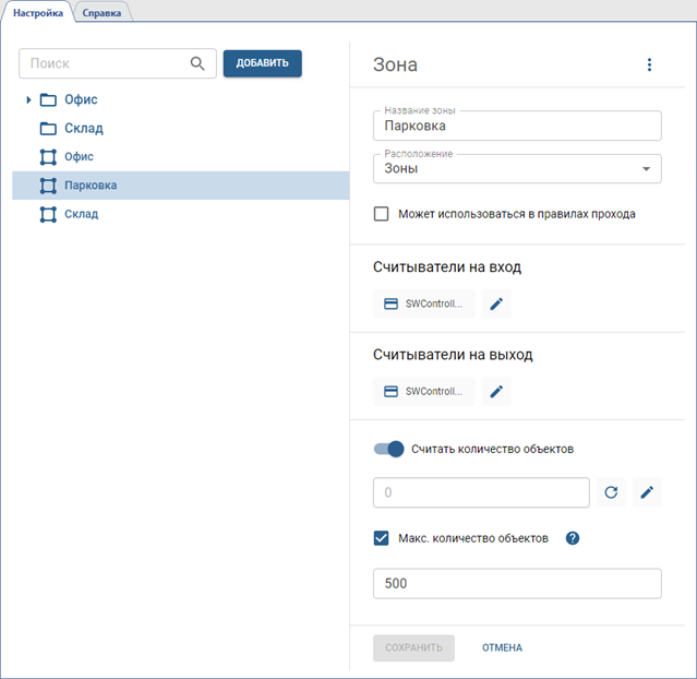 Чтобы отслеживать перемещение персон внутри охраняемого периметра, необходимо создать зоны и выбрать считыватели, которые будут идентифицировать персон входящих в зону и выходящих из нее. Для этого нажмите кнопку Добавить, выберите пункт Зона и укажите все необходимые параметры.