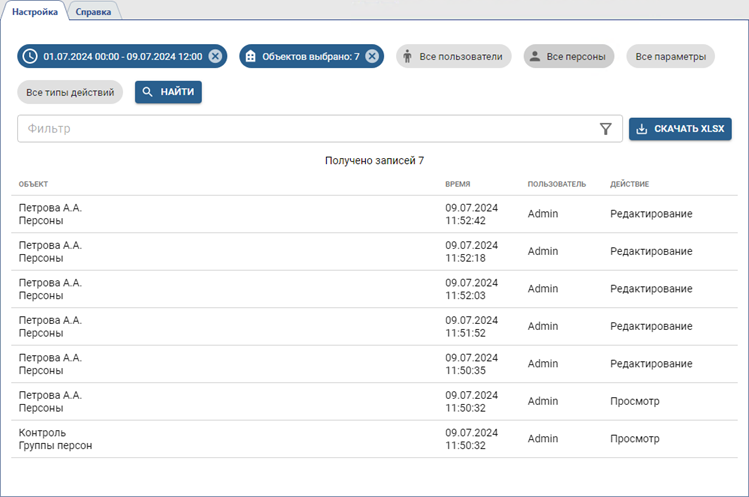 В случае необходимости журнал действий можно сохранить в файл. Для этого нажмите на кнопку Скачать XLSX.