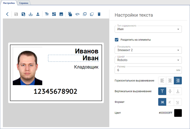 Текст - добавить на макет произвольное текстовое поле или поле с персональными данными сотрудника (в том числе, Дополнительные поля персоны). Текстовые поля, состоящие из списка значений, такие как Имя, Автомобильные номера, Карты доступа и Уровни доступа, можно расположить на разных полях макета, со своими настройками форматирования. Для этого установите флаг Разделить на элементы и в поле Показывать выберите элемент, который будет отображаться в выбранном поле макета.