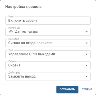 - для типа Управление GPIO выходами в качестве объектов будут использоваться GPIO выходы данного контроллера, а в качестве действия - команда замкнуть или разомкнуть выход.