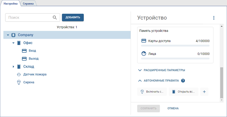 Для создания автономных правил откройте в настройках сервера раздел Модули -> СКУД -> Устройства, выберите контроллер и в его настройках откройте пункт Автономные правила.