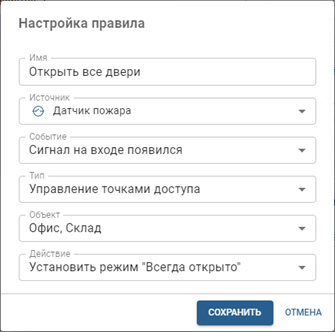 Все созданные правила хранятся в памяти контроллера и будут работать в случае потери связи контроллера с сервером TRASSIR СКУД.