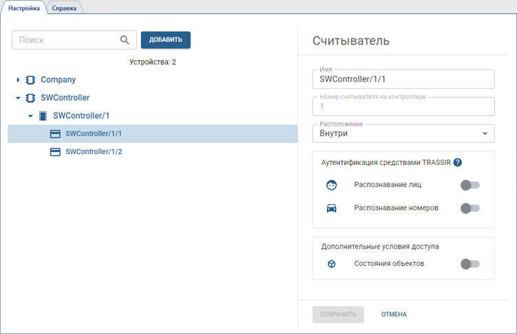 Количество считывателей, используемых для детектирования нарушений прохода, определяется числом лицензий LICENSE_PACS_VA_PASS_DETECTOR, приобретенных в дополнение к базовой лицензии TRASSIR СКУД на сервере.