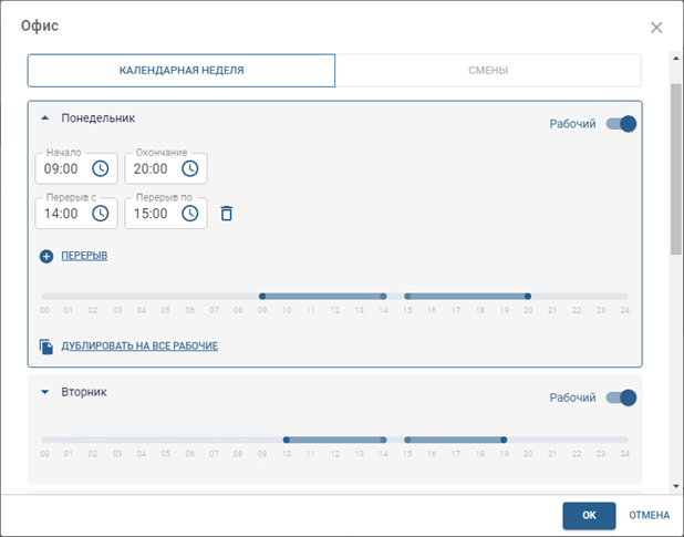 Чтобы создать смену, которая начинается в один день, а заканчивается в другой, нужно в поле Окончание выбрать время, которое будет меньше или равно времени в поле Начало.