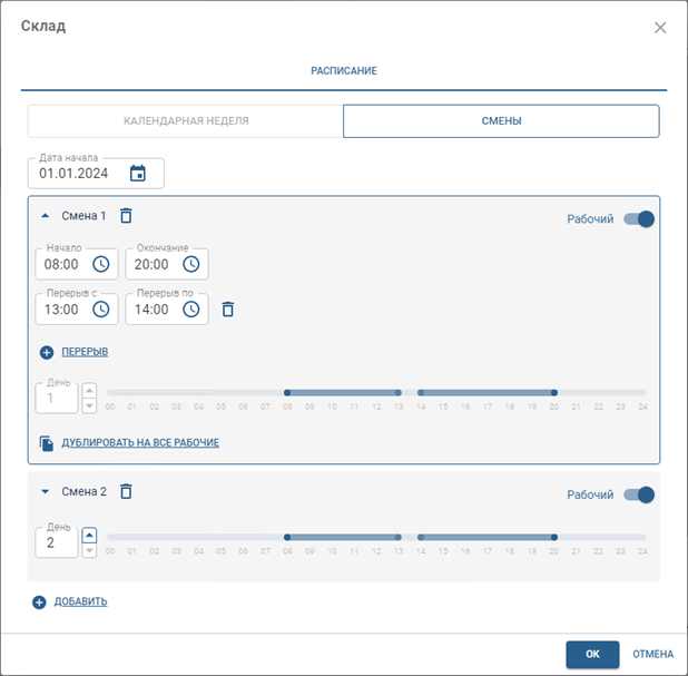 - Смены - расписание, задающее цикл интервалов, в которых расписание зависит от номера дня в цикле.