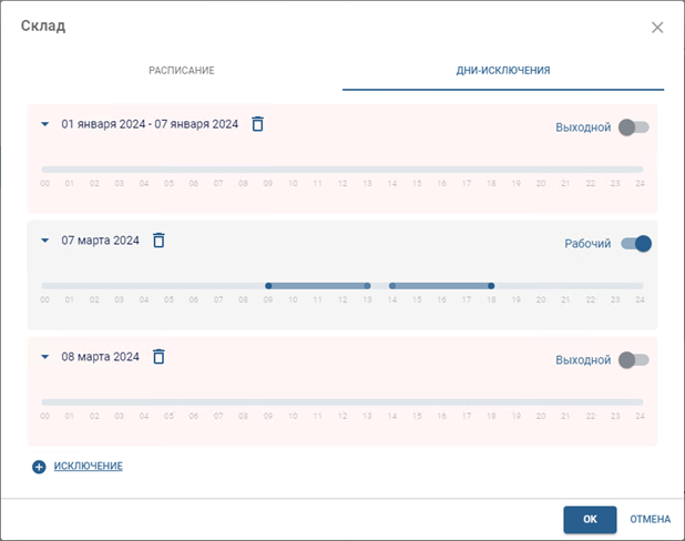 На вкладке Дни-исключения вы можете добавить даты, когда будет действовать другое расписание (например, в предпраздничные и праздничные дни). |