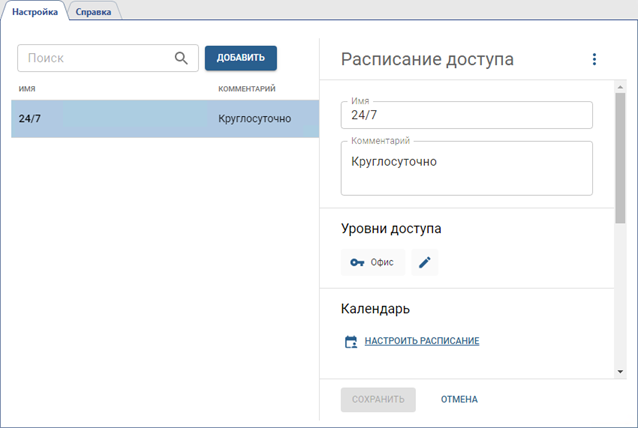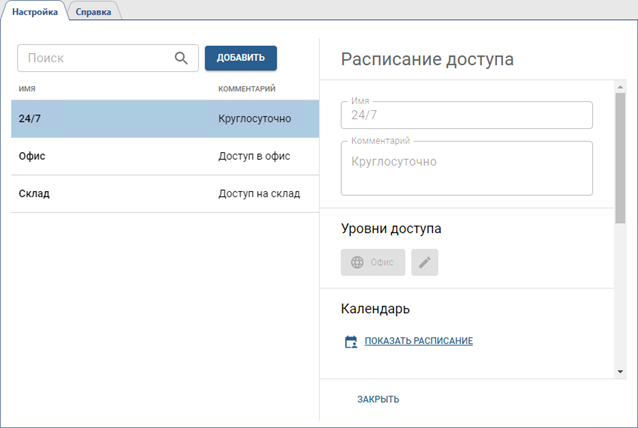 Данный раздел позволяет создавать и редактировать расписания, используемые для настройки уровней доступа.