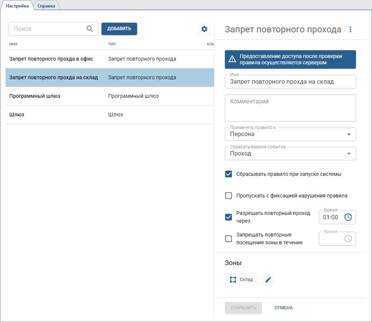 Для создания нового правила нажмите Добавить, выберите пункт Запрет повторного прохода и выполните следующее: