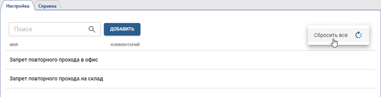 Для того чтобы сбросить текущее местоположение персон, использующих все правила прохода нажмите на кнопку
