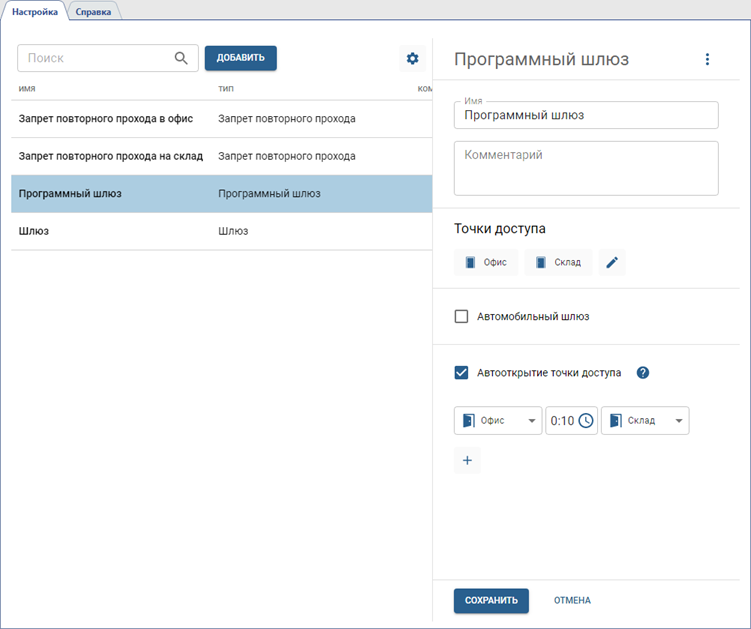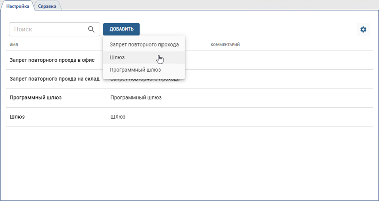Шлюз — этот тип позволяет настроить правило, обеспечивающее контроль последовательного прохода через несколько точек доступа, объединённых в шлюз. При создании правила указывается устройство и список точек доступа, которые составят шлюз.