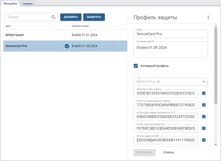 Установите флаг Активный профиль, чтобы активировать текущие настройки защиты при работе с картами и обеспечить их безопасное использование в системе доступа.