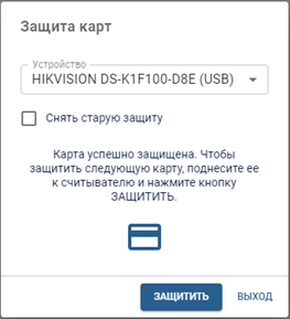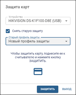 В открывшемся окне выберите Устройство, к которому будет прикладывать карты. Затем приложите карту к считывателю и нажмите кнопку Защитить. Повторите процедуру защиты для остальных карт. Если необходимо отключить предыдущий уровень защиты и включить новый, поставьте флаг Снять струю защиту и выберите Старый профиль защиты. |
