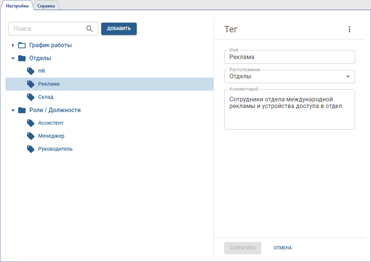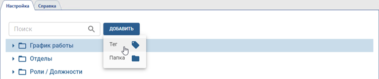Данный раздел позволяет создавать, редактировать и удалять теги, а также группировать их в папки. Чтобы открыть раздел, перейдите в Модули -> СКУД -> Теги. Для того чтобы добавить тег, нажмите кнопку Добавить, выберите пункт Тег.