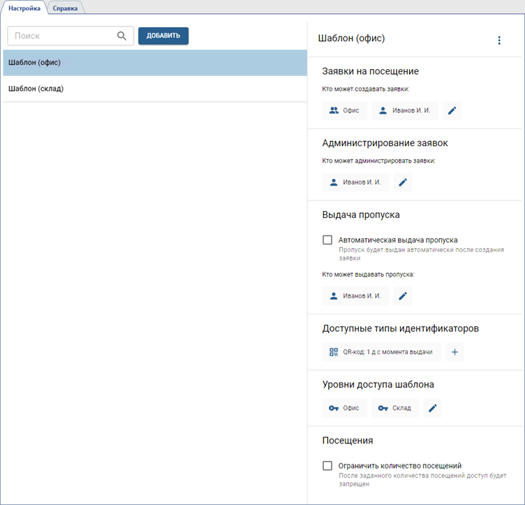 Выберите Уровни доступа шаблона, которые будут предоставлены посетителю, получившему временный пропуск на посещение (см. раздел Уровни доступа персон).
