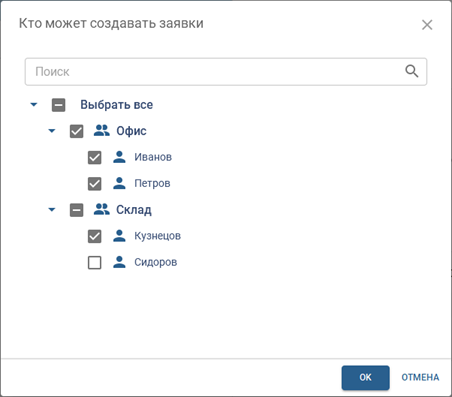 Выберите персоны или группы персон, которым будет доступна функция создания заявок на пропуск.