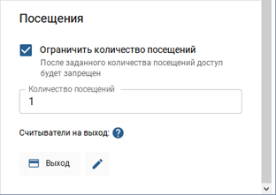 Для создания шаблона пропуска с одноразовым использованием или с ограниченным количеством проходов, необходимо указать Количество посещений и выбрать считыватели, через которые произойдет завершение посещения. После заданного количества посещений пропуск, с указанным в нем идентификатором персоны, автоматически станет недействительным.