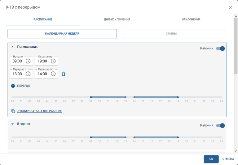 - Календарная неделя - расписание, которое позволяет задать рабочий график с привязкой к конкретным дням недели.