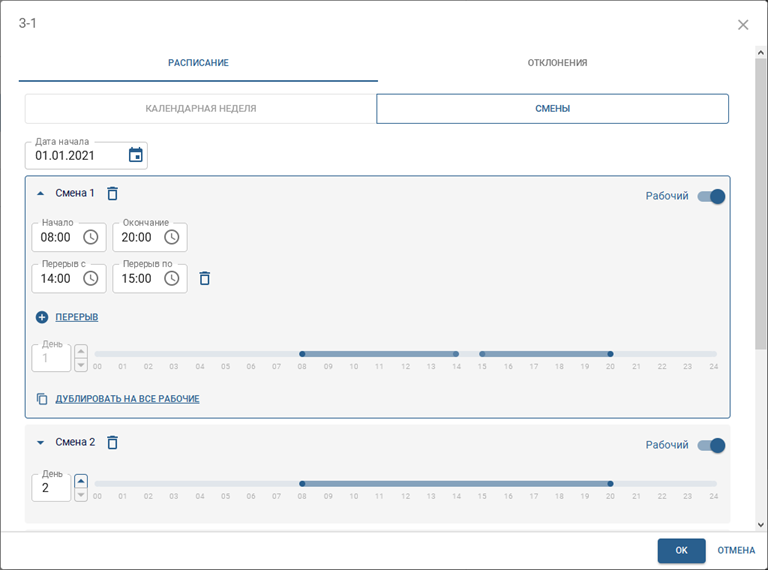 - Смены - расписание, задающее цикл интервалов, в которых рабочий график зависит от номера дня в цикле.