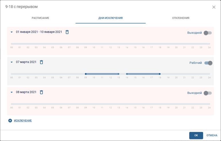 На вкладке Дни-исключения вы можете добавить даты, когда будет действовать другое расписание (например, в предпраздничные и праздничные дни). |