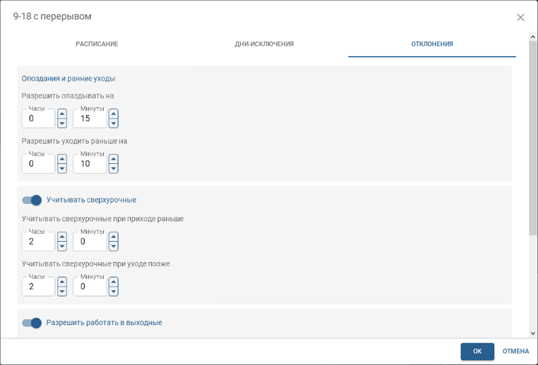 На вкладке Отклонения представлены параметры, которые вы можете использовать для более гибкой настройки рабочих графиков сотрудников.