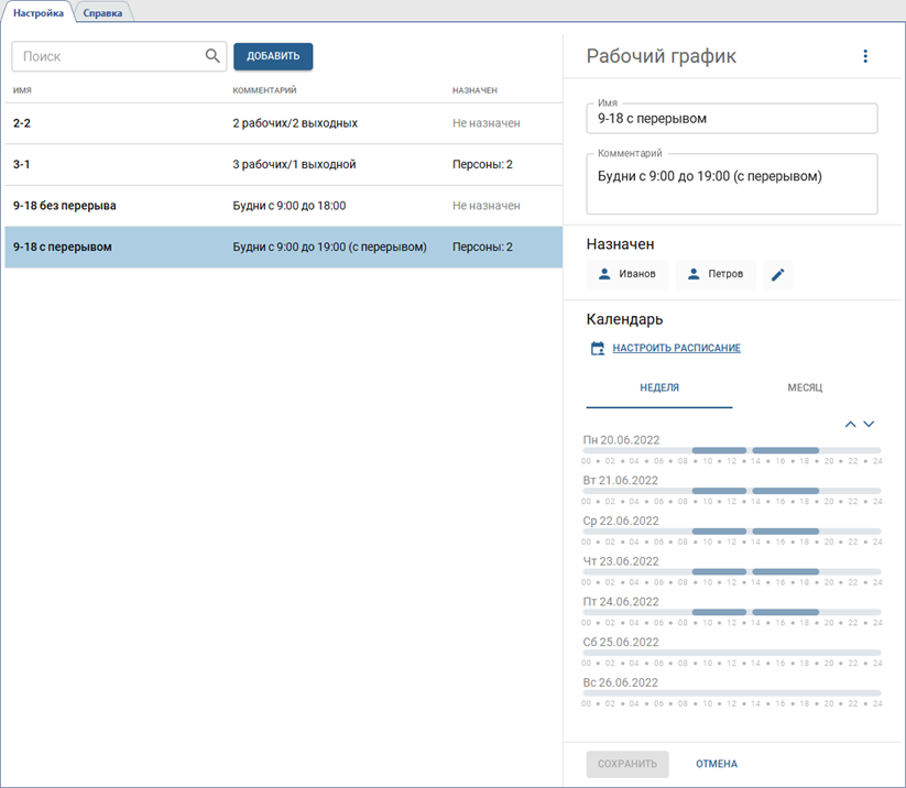 Для создания нового рабочего графика нажмите кнопку Добавить и выполните: